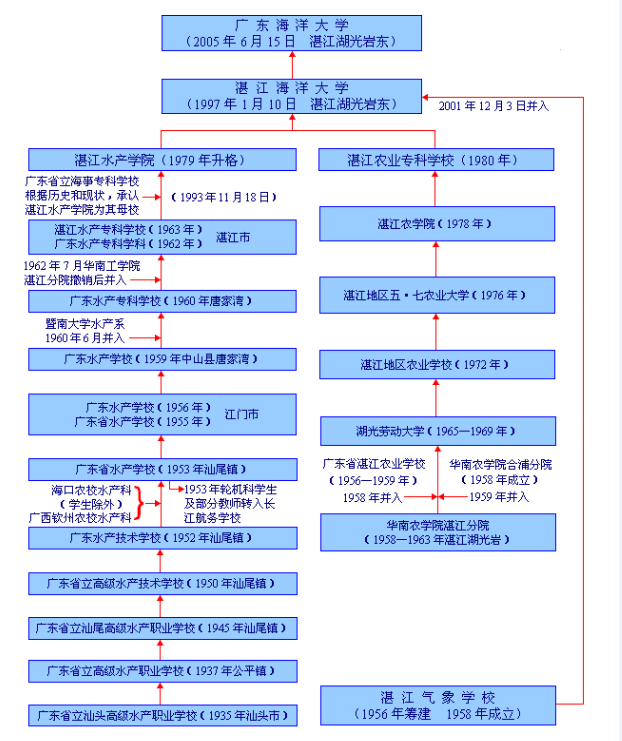 学校的前身是创建于1935年的广东省立高级水产职业学校,是广东现代海洋水产教育的发端,原暨南大学水产系,原华南工学院(现华南理工大学)湛江分院先后并入,1979年升格发展为农业部直属的湛江水产学院,经教育部批准,具有62年办学历史的湛江水产学院和39年办学历史的原华南农学院(现华南农业大学)湛江分院为基础发展起来的湛江农业专科学校,1997年进行实质性合并组建为湛江海洋大学,2001年12月,国家气象局主管的全国重点中专湛江气象学校并入湛江海洋大学 宅男视频,2005年6月,湛江海洋大学更名为广东海洋大学。